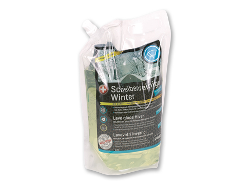 Winter-Scheibenreiniger aus Schweizer Produktion für gute Reinigungsleistung bis - 20 °C. Fertigmischung für die Autoscheiben- und Scheinwerferwaschanlage. Schont Lack, Gummi, Kunststoff und Metall, polycarbonat-verträglich, fächerdüsen-tauglich. Gut biologisch abbaubar.